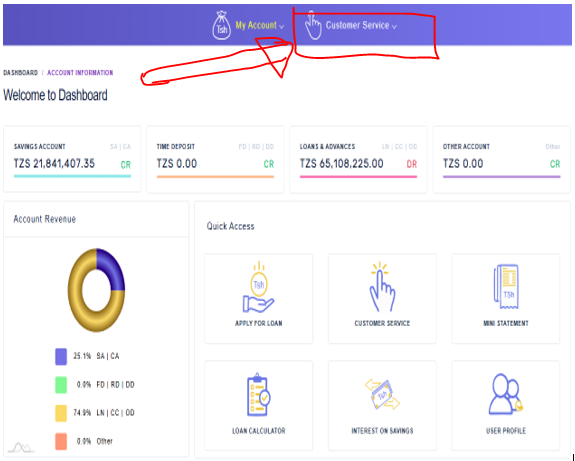 2. Kwenye dashboard bofya Customer Service kisha ----> Chagua Service Request kwenye mfumo wa Members Portal.