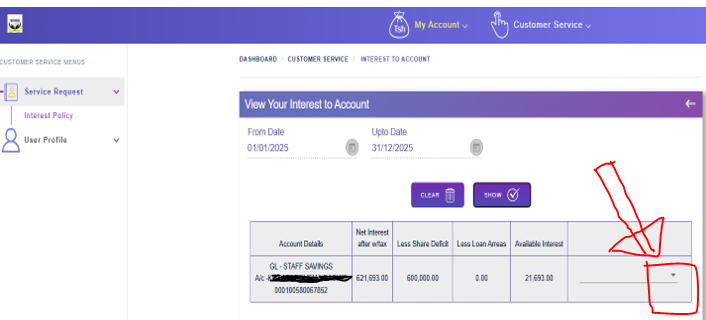 4. Baad ya kubofya Interest Policy, Interest uliyoipata kuanzia 01.01.2025 - 31.12.2025 Utabonyeza buton ya Show ---> Litatokea Jedwali ---> Kisha bofya Button ya take action na utachagua "Interest Transfer"