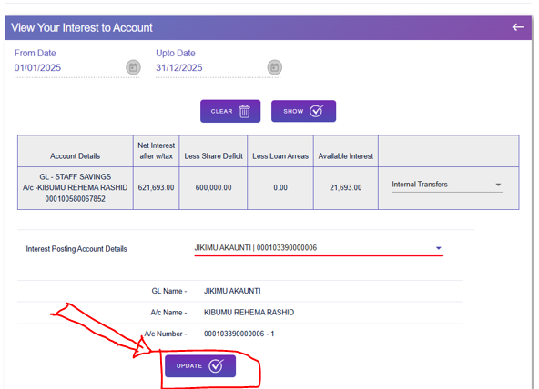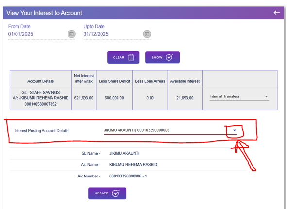 5. Badaa ya Kuchagua "Interest Transfer", Window ya maamuzi itatokea chini ya Jedwali, ambapo utaamua Interest yako iwekwe kwenye Akaunti utakayochagua, mfano hapa Mwanachama amechagua kuwa alipwe kupitia akaunti ya JIKIMU